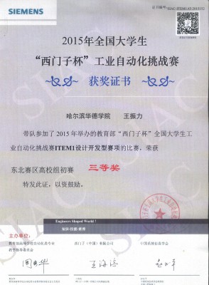 第九届“西门子杯”工业自动化挑战赛东北赛区比赛于7月20日在哈尔滨工程大学举行。本次比赛历时2天,来自东北三省22所学校的81支队伍在设计开发和逻辑控制两个项目中展开了激烈的角逐。经过2天紧张激烈的赛程,由我院王振力老师指导,由唐世超、于泽瀚、杨银龙三名同学组成的华德机器人队获得设计开发组三等奖。由林森老师指导,王晨、王星驰、白耀川三名同学组成的华德勇闯队获得逻辑控制组三等奖。
