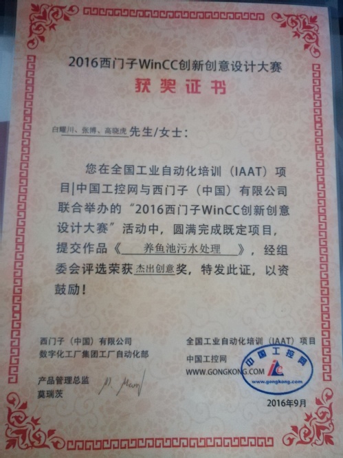 经过2个月的精心准备,我院学生白耀川、张博和高晓虎荣获2016年西门子WinCC创新创意设计大赛杰出创意奖。