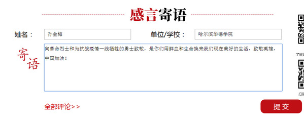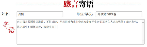 “无数革命烈士的鲜血,换来了新的中国,新的时代,新的生活。和平生活来之不易,要牢记历史,缅怀英烈。” ---教师 逄崇雁