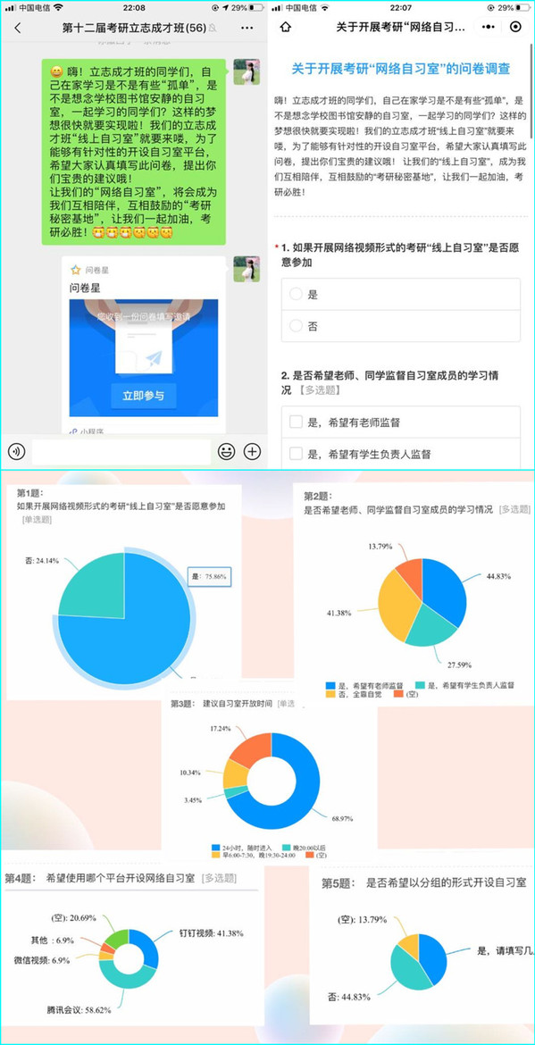 会议第二环节——“考研线上自习室”启动会。在疫情防控特殊时期,为缓解学生备考压力,帮助考研学子搭建一个考研交流平台,营造比学习、促学习的整体学习氛围。立志成才班指导教师金文雯结合我院“雏鹰计划”学风建设工程方案具体要求,以新媒体平台授课方式为参考,克服疫情下的实际困难,创新式提出成立“线上自习室”想法,通过“云”端自习室,创新互助学习模式。经学院领导同意,采用发放问卷调研的方式向考研学生征集成立意见和看法,得到了考研学子的一致好评。会议中,金文雯老师向同学们介绍了线上自习室的管理办法、线上平台使用方法等。当晚20时,立志成才班“考研线上自习室”正式在腾讯会议平台启动。