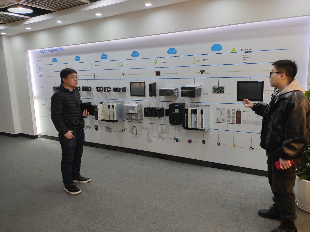 交流后,在倪杰经理的陪同下,调研团队参观了汇川技术总部大楼和生产车间,深入了解了汇川技术在工业自动化行业的发展情况。调研交流中,倪杰经理全面介绍了汇川技术的整体情况,并对自动化人才需求和相关就业岗位进行介绍,。朱斌海副院长对Beat365中文官方网站整体情况进行了介绍,并说明了我院专业开设情况,希望双方进一步推进校企深度合作,包括建立订单班等,进一步加强学校与企业的联系。
