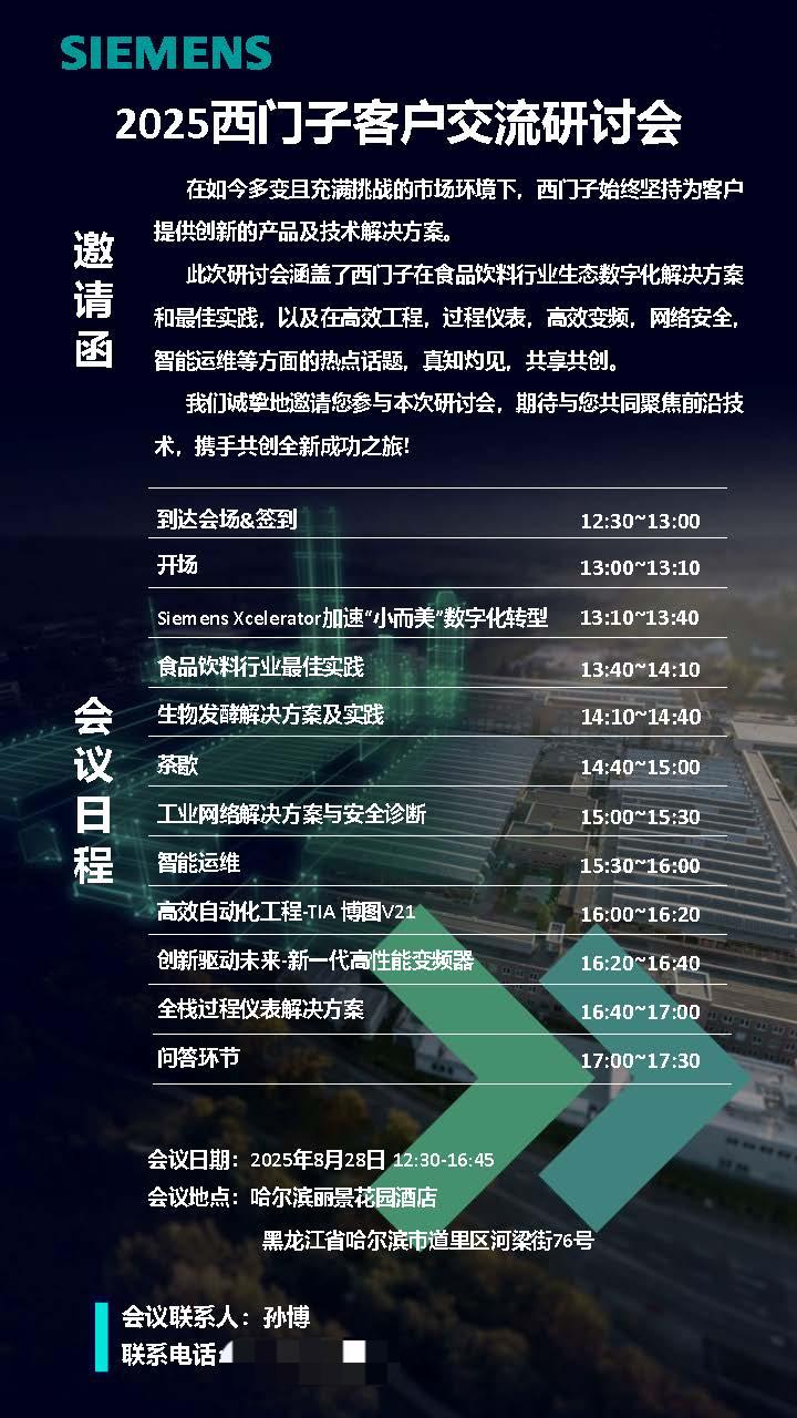 近日,西门子数字化工业集团于黑龙江省哈尔滨市组织召开东北区食品饮料行业交流研讨会。Beat365中文官方网站副院长王振力、电气工程及其自动化系孙昊老师受邀参会。