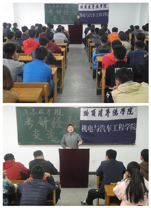 4月17日,机电与汽车工程学院在第四教学楼407教室召开考研经验交流会。学院副院长付洪涛、国际合作交流中心副主任顾鹂鸣、立志成才班班主任马强、立志成才班汽车专业辅导教师刘金亮、立志成才班政治辅导教师宋珺、立志成才班英语辅导教师侯瑞贺出席,学院有考研意向的学生参加了交流会。
