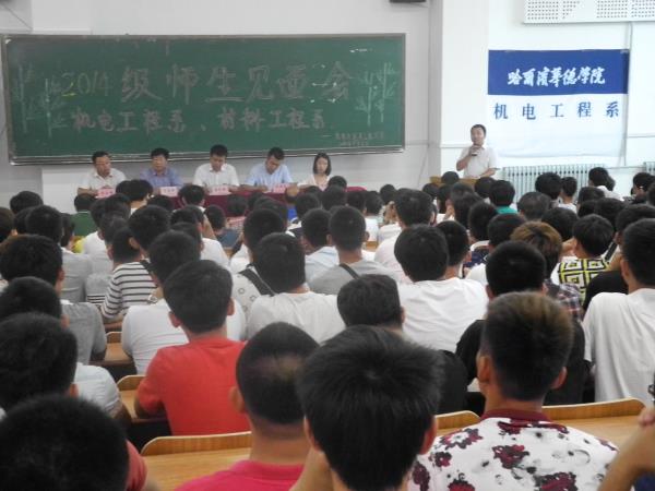 9月2日,我院在第二教学楼J102教室开展2014级新生入学教育活动之:师生见面会。此次师生见面会共分两场次,副校长邓维娜;我院常务副院长李长威;校特聘专家、博士生导师于建国;副院长吴柏宇、付洪涛;机电工程系副主任孙立峰;材料工程系副主任杨德云;汽车工程系副主任宁士君及分院各教研室教师、全体辅导员出席,分院2014级全体学生参加会议,会议由分院院办副主任、团总支负责人范雪阳主持。
