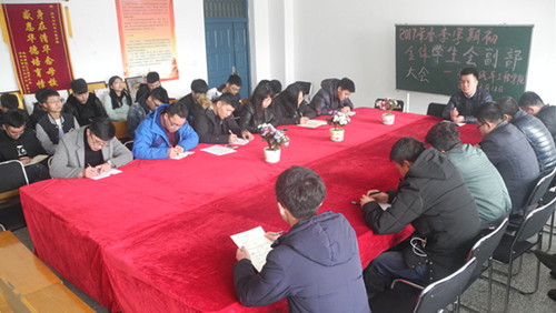 付洪涛副院长做总结讲话,他讲到,本学期将以评估整改工作为主线,群力群策,优质高效完成每项工作,他要求全体学生干部,一要严格遵守学校章程,言行举止大方得体,养成良好会风,重在落实;二要各司其职,表里如一,全心全意为班级建设为学院发展谋策略,努力学习扎实基础,在学习上做班级的领头雁,在工作中做学院的排头兵;三要结合本学期校级工作重点,逐一落实学院各项工作,紧紧围绕科技节、体育节、校庆25周年、运动会开展形式多样的特色活动,以赛促学,营造整体学风氛围。