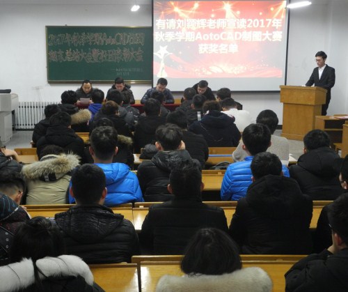 会上,刘颖辉老师宣读了2017年秋季学期AotoCAD制图大赛的获奖名单,并为“优秀个人”颁奖。会上,1702113班孟凡坤同学代表发表,指导教师陈福民做本学期AotoCAD社团期末总结。