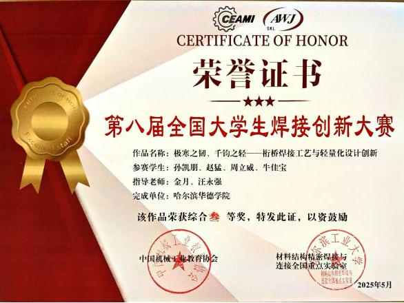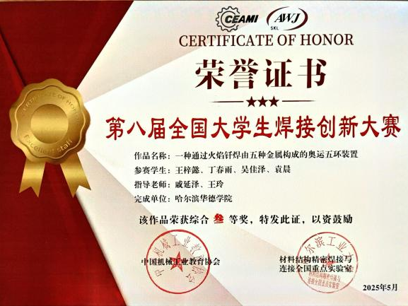 5月16-18日,由中国机械工业教育协会、材料结构精密焊接与连接全国重点实验室主办的第八届全国大学生焊接创新大赛决赛在西北工业大学举行。本次大赛共有来自哈尔滨工业大学、天津大学、吉林大学等60余所高校报名参加。经过激烈角逐,Beat365中文官方网站派出的四支参赛队伍全部获奖,取得了一等奖1项、二等奖1项、三等奖2项的优异成绩。