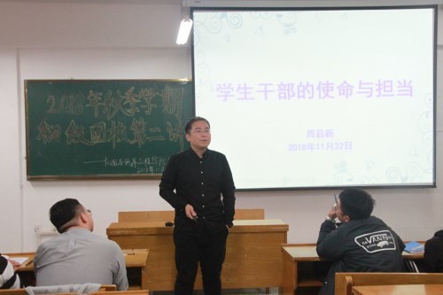 为加强学生干部对于自身的定位以及使命感,11月20日,机电与汽车工程学院在第四教学楼 401教室开展2018年秋季学期初级团校第二讲:“学生干部的使命与担当”。学院学工副院长周启新担任主讲。