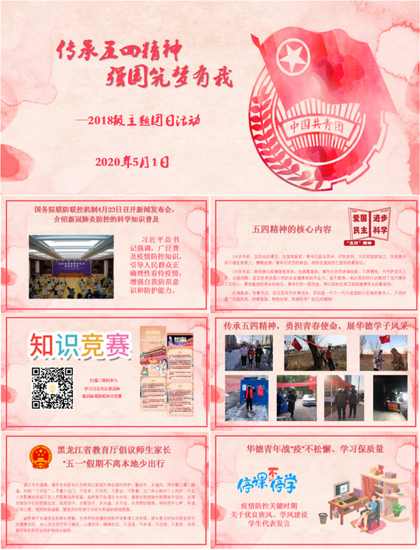 为加强我院团员青年日常教育管理,引导团员青年牢固树立“四个意识”,坚定“四个自信”,坚决做到“两个维护”,用奋斗的青春展现时代新人的家国情怀,5月1日-4日,机电学院团总支积极组织各团支部开展“传承五四精神,强国筑梦有我”网络主题团日活动。活动开展期间,支部成员群策群力,以大我的姿态抗疫,以小我的姿态力行,充分利用新媒体平台,展现了支部活动的与时俱进。