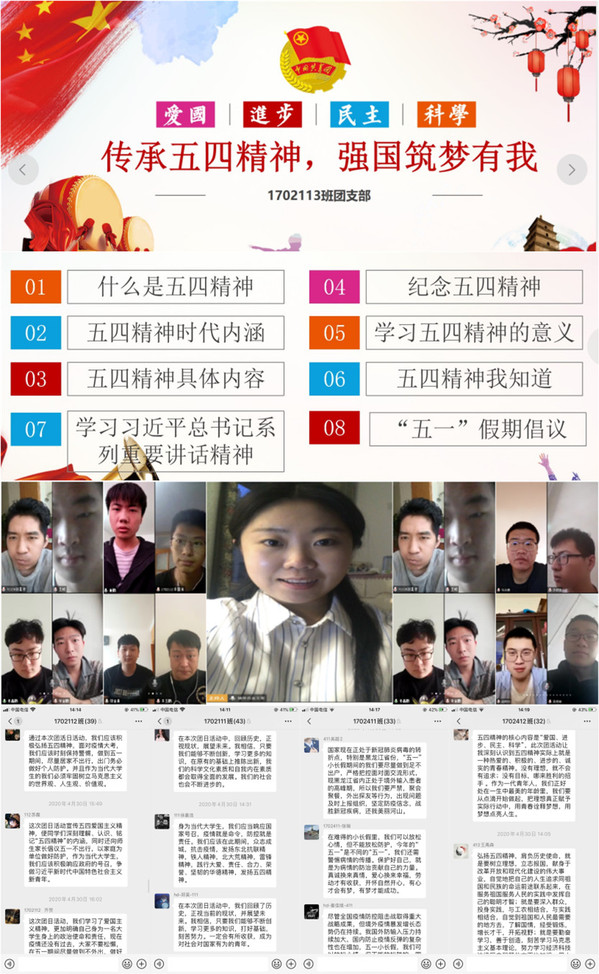 本次团日活动,学院所有团支部严格规范活动流程,做到人人参与,事事尽心。面对着屏幕唱团歌、重温入团誓词;通过理论学习增强自信,并将爱国主义教育植入到团日活动中;不负青春,勇于追梦,让家国情怀始终成为人生底色。团日活动充分展现了各团支部成员凝心聚力抗击疫情的决心,团员青年纷纷表态,将努力成长为能够担当民族复兴大任的时代新人。