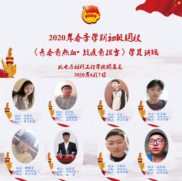 6月7日,机电学院团总支通过团课“云”发声的形式开展2020年春季学期初级团校《青春有热血•战疫有担当》学员讲坛,学院党总支书记王郁黎、团总支书记杨志承、全体辅导员及初级团校全体学员参加培训,会议由初级团校负责人1802111班王传胤主持。
