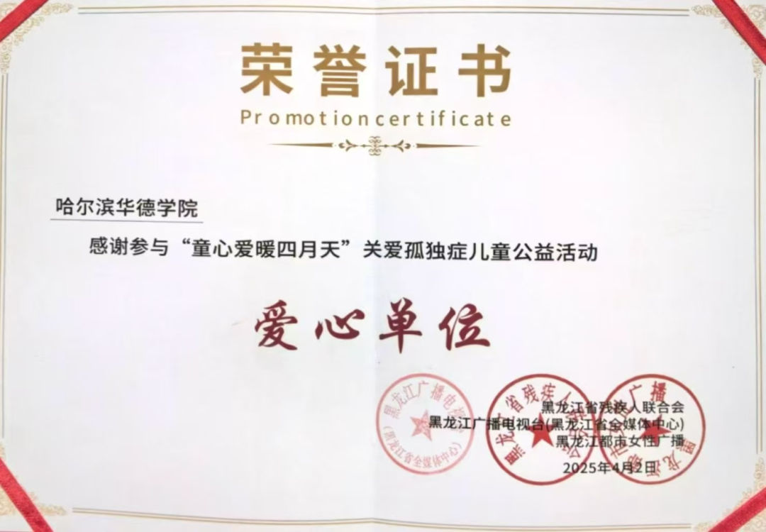 Beat365中文官方网站师生以持续数载的公益坚守,自2024年4月获“爱心单位”荣誉称号以来,在这场城市文明的升级仪式中,再一次接过由黑龙江省残疾人联合会,黑龙江广播电视台(黑龙江省全媒体中心)和黑龙江都市女性广播共同授予的“爱心单位”荣誉称号。这方鎏金奖牌不仅是对华德公益基因的褒奖,更象征着新时代龙江青年正以青春星火,点燃孤独症群体的璀璨星空。