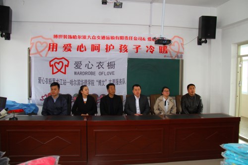 4月13日,我校“博文”党员志愿服务队携手中华社会救助基金会“爱心衣橱”黑龙江站志愿者代表、哈尔滨市大众交通运输服务有限公司爱心人士,共赴距哈尔滨市区160公里的望奎县东升乡中心小学开展“爱心衣橱”新衣发放活动。参与本次活动的包括校团委书记姜琳、机电学院党总支书记付洪涛、机电学院辅导员赵强、大众交通运输服务有限公司工会主席夏斌、望奎县团委领导赵娜、中心小学校长毛凤阁。本次新衣发放志愿服务活动共计发放冲锋衣223套,总价值20余万元,历时四个小时。“送出温暖,传递爱心”, 送出的是衣物,但带去的确是温暖与关心,是对孩子们未来的期望。