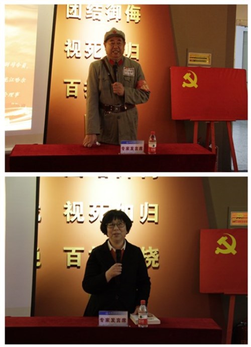 顾德库校长做总结讲话,他首先对两位专家的到来表示感谢,感谢两位专家以红色后代的身份为同志们带来真实感人的、鲜活的、充满激情的讲述,让我们感同身受的、全面透彻的体会到东北抗联精神;感谢的同时更多的是感动,感动两位专家用亲身的经历将东北抗联精神得以传承,从红色文化的深厚底蕴到红色记忆的代代相传,无处不渗透着东北抗联精神的缩影。最后,顾德库校长谈到的是感想,他讲到,学校一直以来致力于倡导、挖掘和整理区域红色文化,并于今年在我校落成校园文化展馆之一的东北烈士纪念馆分馆,希望通过大力发展红色精神和红色文化,形成校园文化品牌力量,以文育人,以文化人,为弘扬和传承红色精典文化做出贡献。