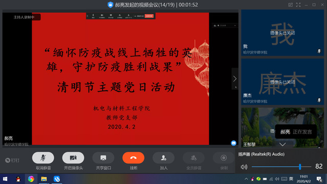 4月2日,机电与材料工程学院教师党支部通过钉钉平台开展“缅怀防疫战线上牺牲的英雄,守护防疫胜利战果”主题党日活动,教师党支部全体党员参加,活动由党支部组织委员郝亮老师主持。
