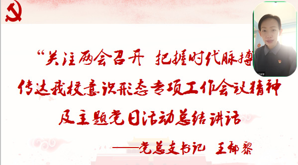 最后,王郁黎书记作总结讲话。首先,她充分肯定了本次主题党日活动的重要意义。她强调,在这特殊时期,全体党员教师应紧紧团结在以习近平同志为核心的党中央周围,立足本职岗位,在教育教学工作中,充分发挥党员先锋模范作用。随后,她向与会党员传达了5月23日我校意识形态专项工作会议精神,并详细介绍了当前学校、学院意识形态工作整体情况及下一步工作部署,并要求全体教师党员坚决贯彻执行我校“强化责任担当,加强思想引领,营造良好舆论氛围”的意识形态工作要求,用实际行动展现华德教师党员风采,用“硬核”的工作态度为母校28岁生日献礼。