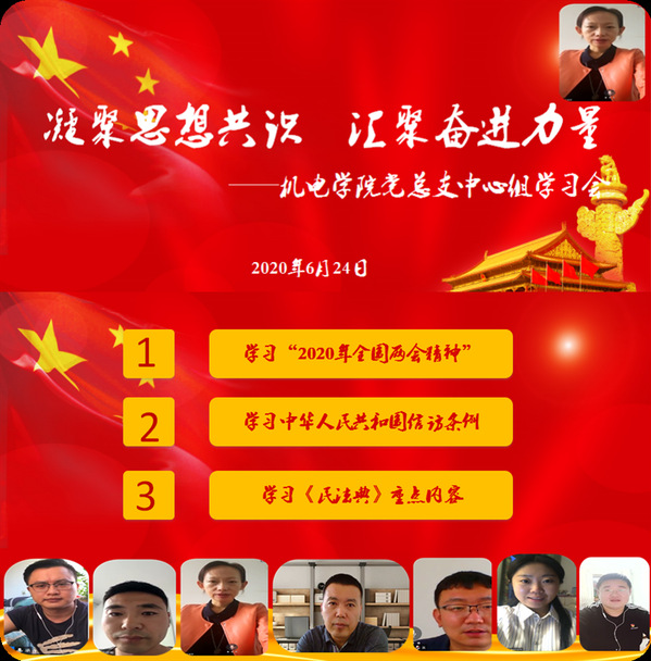 为进一步强化学院党总支理论学习中心组学习,提高党员领导干部政治素养和理论素养,提升决策水平,增强工作本领。6月24日,机电学院党总支通过“腾讯会议”平台开展“凝聚思想共识,汇聚奋进力量”中心组理论学习会议。全体中心组成员出席,会议由学院党总支书记王郁黎主讲。