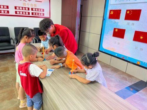 红色旗帜“认”在心中,爱国教育坚定理想 。团队成员带领小朋友们认识了5面极其重要的旗帜——国旗、党旗、军旗、共青团团旗和少先队队旗并介绍了它们的历史背景。当队员们拿着承载红色精神的国旗升降台模型出现时,孩子们的眼中闪现出热切的光芒,心潮澎湃地想要亲手搭建模型。团队成员带领着小朋友们有序合作地搭建模型,他们合理分工,互相协作,大家在一片欢声笑语中完成了模拟国旗升降台的制作,孩子们在此也懂得了合作的力量,加深了彼此之间的友谊,提高了动手能力。