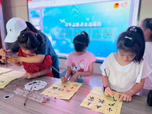 图为小朋友们在团队成员的协助下完成毛笔字的书写