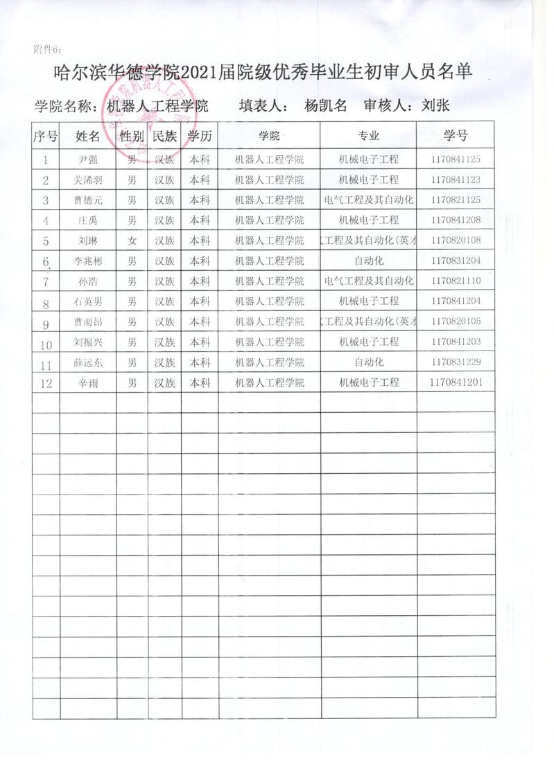 Beat365中文官方网站机器人工程学院2021届院级优秀毕业生初审人员名单