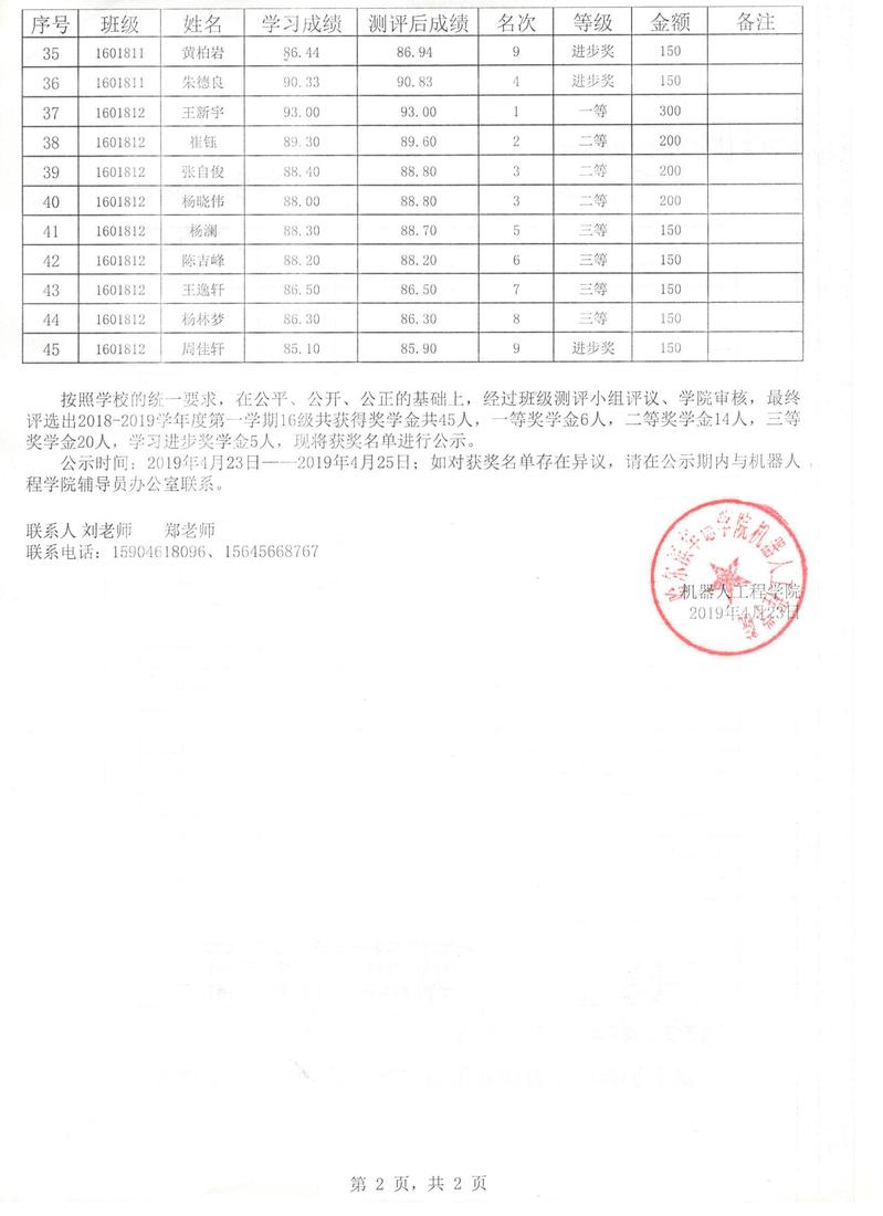 机器人工程学院2018-2019学年度第一学期奖学金公示名单