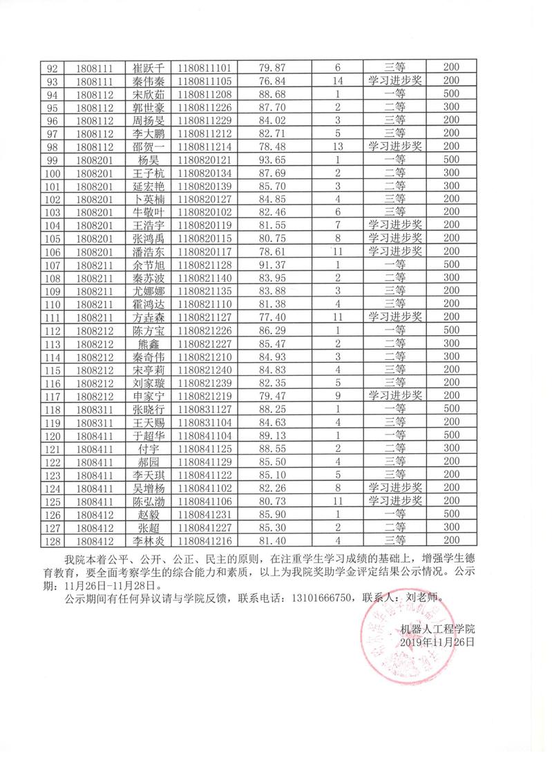 机器人工程学院2018-2019学年度第二学期学校奖学金公示