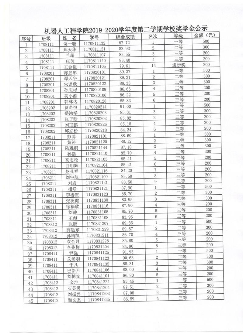 机器人工程学院2019-2020学年度第二学期学校奖助学金公示
