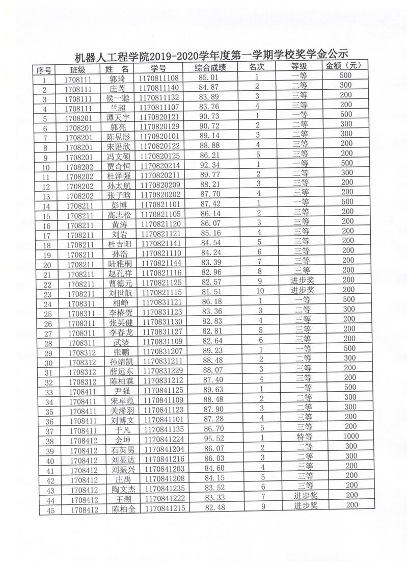 机器人工程学院2019-2020学年度第一学期学校奖助学金公示