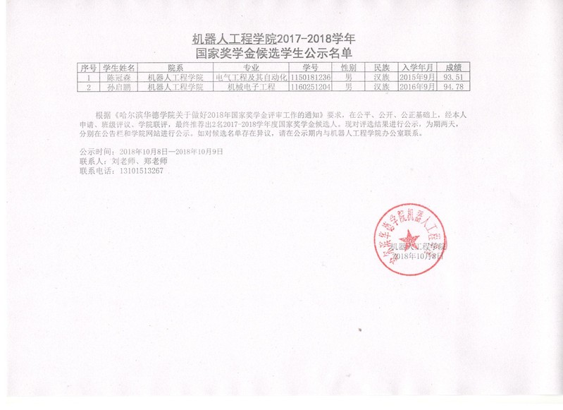 机器人工程学院2017-2018学年国家奖学金候选学生公示名单