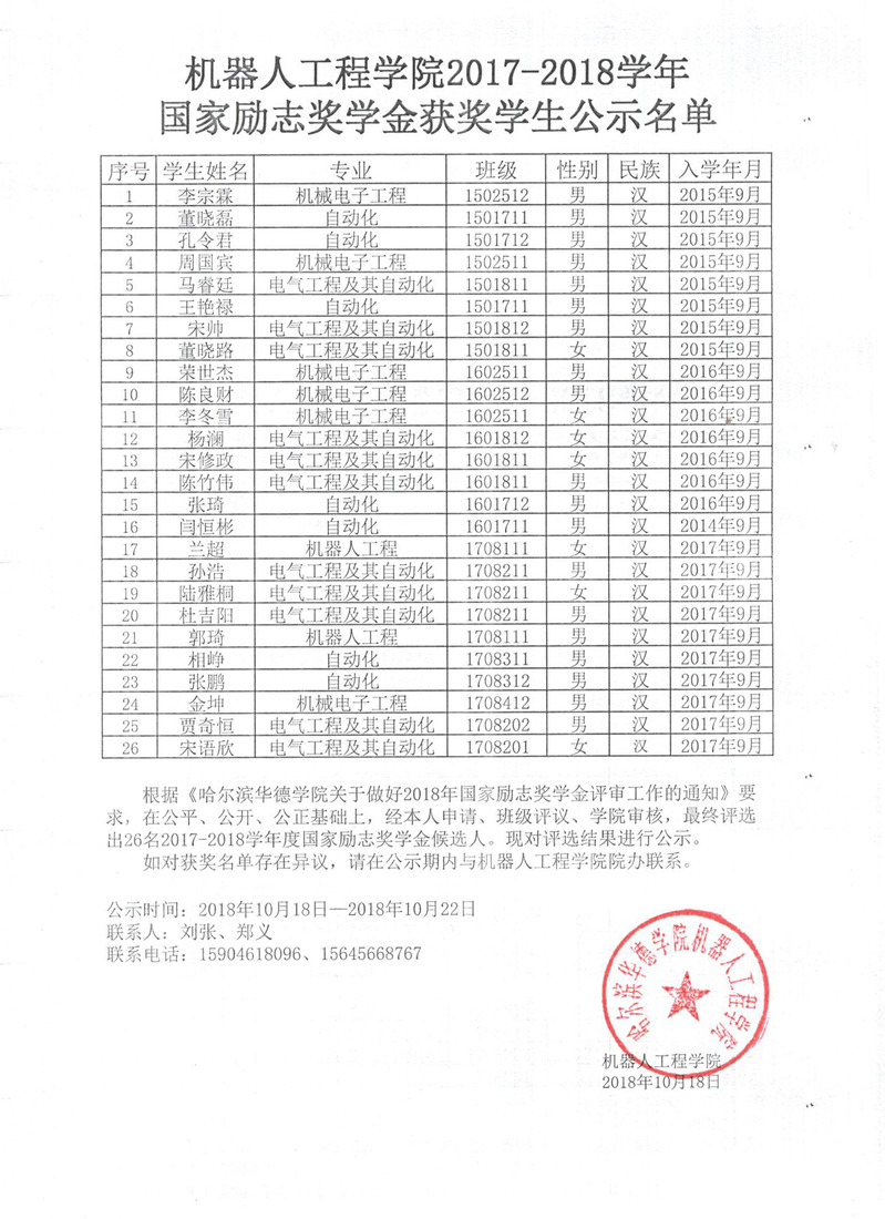 机器人工程学院2017-2018学年国家励志奖学金获奖学生公示名单