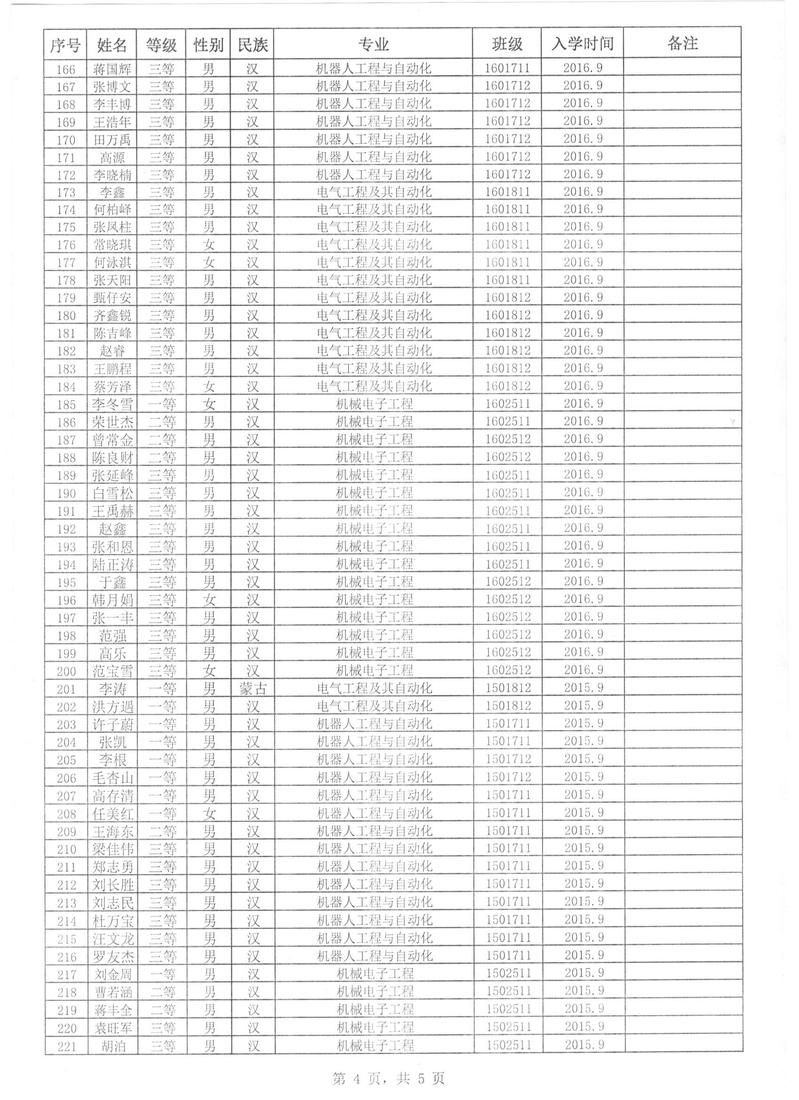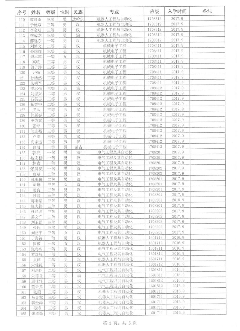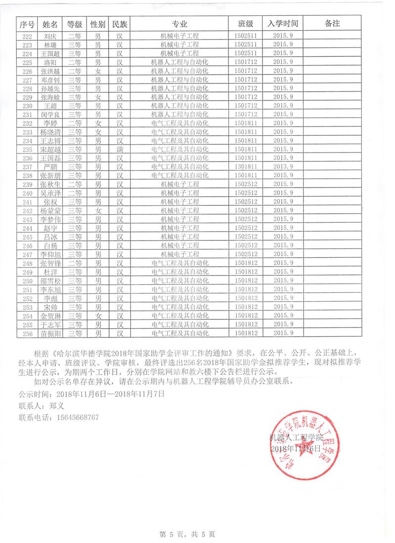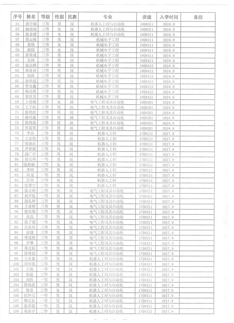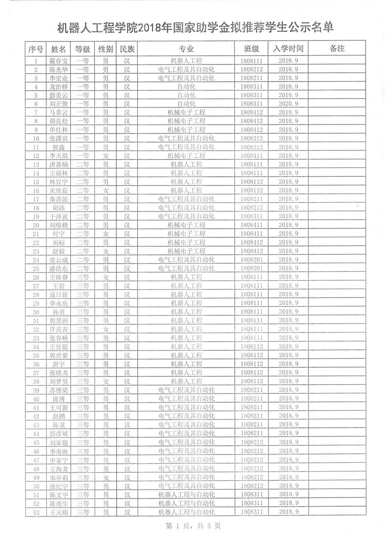 机器人工程学院2018年国家助学金拟推荐学生公示名单