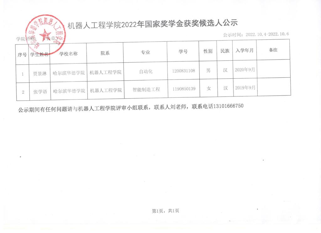 机器人工程学院2022年国家奖学金获奖候选人公示