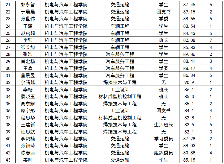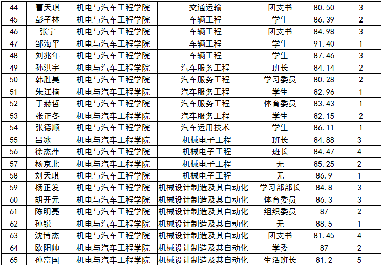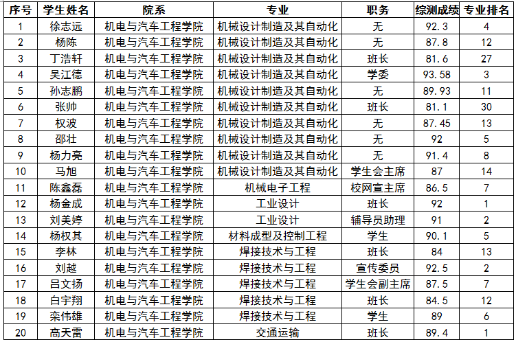 根据《Beat365中文官方网站关于做好2016年国家励志奖学金评审工作的通知》要求,在公平、公开、公正基础上,经本人申请、班级评议、学院审核,最终评选出65名2016年国家励志奖学金获得者。现对评选结果进行公示。入队获奖名单存在异议,请在公示期间内与机电与汽车工程学院联系。