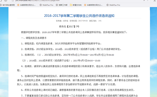 2016-2017学年第二学期学生公共选修课选课通知已发布到教务处网站上,请查看此通知,同学们相互转告,按时选课。操作流程学生自行到教务处网站查看!千万不要耽误选课!