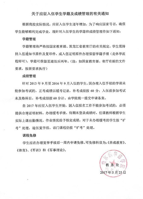 关于应征入伍学生学籍及学生成绩管理的有关通知