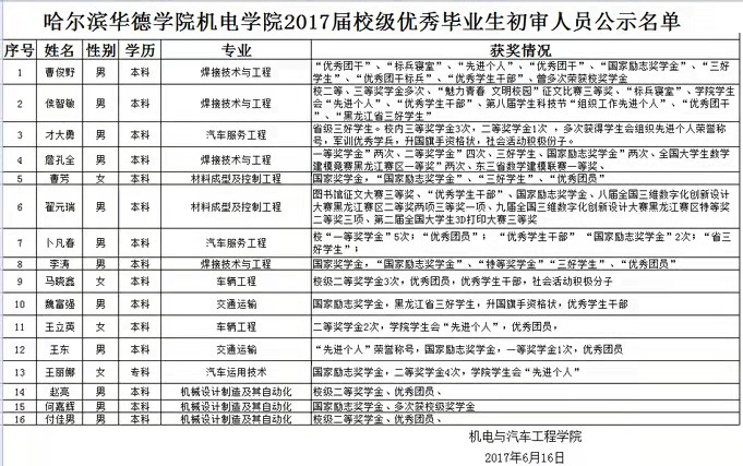 Beat365中文官方网站机电学院2017届校级优秀毕业生初审人员公示名单