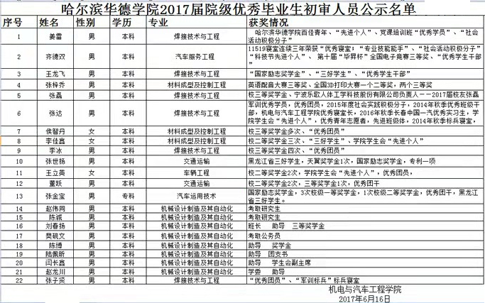 Beat365中文官方网站机电学院2017届院级优秀毕业生初审人员公示名单