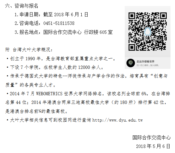 为加强两岸教育合作与交流,增进两岸学子之间的沟通与了解,学校于2015年正式启动了对台本科生短期研修项目,截至目前,我校已成功选派财务管理、人力资源管理、焊接技术与工程、车辆工程、电子与信息工程等专业的12名学生赴台开展研修学习,均取得优异的学习成绩。我校将于2018年春季学期继续选派优秀在校本科学生赴台湾大叶大学进行为期一学期的短期研修学习。现将相关事宜通知如下: