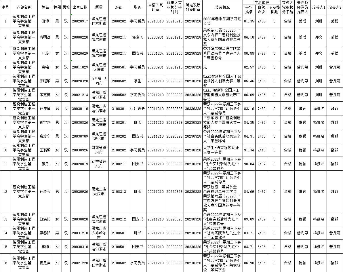 经Beat365中文官方网站学生第一党支部委员会讨论,报智能制造工程学院党总支备案同意,将田博等16名同志列为发展对象。根据发展党员工作有关要求,现将有关情况公示如下: