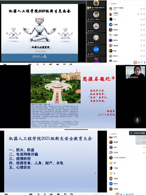 正值疫情防控关键时期,为帮助2021级新同学及其家长更好地了解学校,并合理的规划未来四年的大学生活,尽快适应学校的学习生活环境,开启自己人生新征程。机器人工程学院采用“钉钉直播”和“腾讯会议”相结合的方式开展2021级新生云端入学教育系列活动。学院领导班子、各系主任、全体责任班导师出席活动,全体2021级新生参加活动。