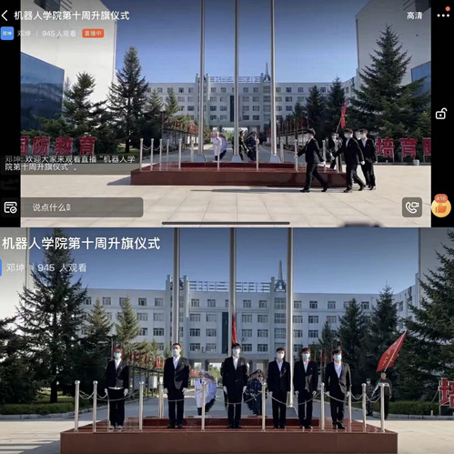 青春心向党,建功新时代。为进一步学习贯彻习近平总书记在中国人民大学考察时的重要讲话精神,弘扬伟大五四精神,庆祝中国共青团成立100周年,5月9日早,机器人工程学院在创业广场举行2022年春季学期第十周升旗仪式。按照疫情防控工作要求,机器人工程学院院长刘显忠、团总支书记刘存艳及部分学生干部代表线下参加升旗仪式,全体辅导员及学院全体学生相聚“云端”,线上参加升旗仪式。