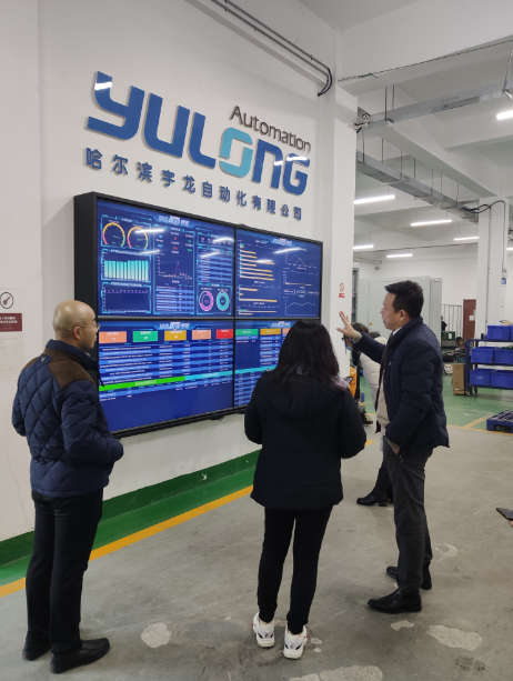 哈尔滨宇龙自动化有限公司总经理赵金晓、副总经理韩海杰热情接待了顾鹂鸣副校长一行,并陪同参观了公司数字化展示中心、自动化装备中心和电气设备物流仓储中心,介绍了企业业务范畴、工程案例和运用模式。