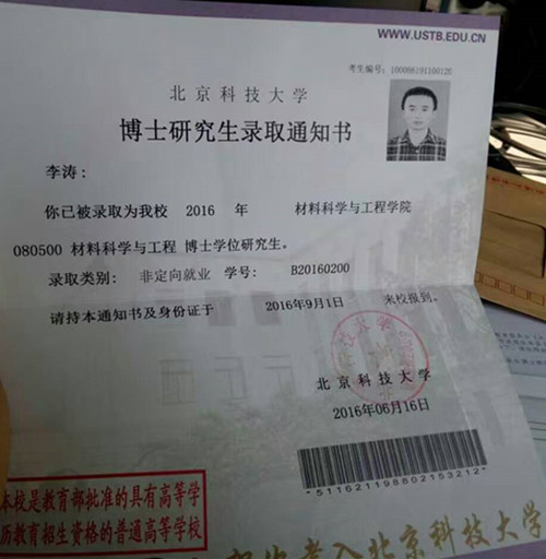 近日,从我院校友会传来消息,机电学院2012届毕业生李涛同学成功考取北京科技大学材料科学与工程专业博士研究生,成为我院深入践行学校“百名研究生计划”的又一丰硕成果。李涛,中共党员,在校期间学习刻苦、工作突出,曾担任辅导员助理、寝室长等职务,大学期间学习成绩为94.65分,曾两次荣获国家励志奖学金、国家助学金,多次获得“优秀学生干部”、“优秀团员”、“三好学生”、“校优秀毕业生”等荣誉称号。