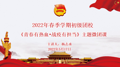 5月17日,为认真领会习近平总书记在庆祝中国共产主义青年团成立100周年大会上的重要讲话精神,引导广大团员青年坚定理想信念,站稳人民立场,练就过硬本领,投身强国伟业,坚定中国特色社会主义制度自信,更加坚定听党话、跟党走。机电学院团总支通过团课“云”发声的形式开展2022年春季学期初级团校第三讲——《青春有热血•战疫有担当》主题微团课,辅导员老师及初级团校全体学员参加培训,主题微团课由团总支书记杨志承主讲。