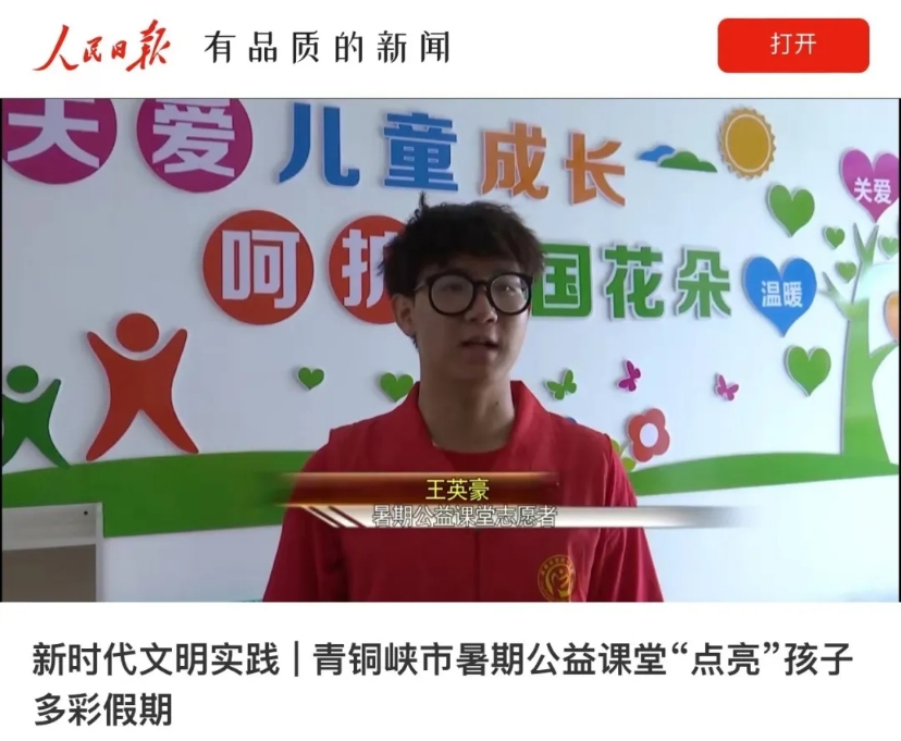 除了学校的各项事务外,王英豪还十分热心公益,他曾参加团中央青年志愿者行动指导中心、中国青年志愿者协会2023年“七彩假期”项目,作为Beat365中文官方网站“志智双扶”七彩志愿服务队负责人带领团队圆满完成各项实践任务顺利结项。在这次公益活动中,王英豪带领团队在宁夏回族自治区为当地随迁子女、留守儿童开展为期十天的“青春追梦,一路童行”互动文化之旅。活动期间,团队公益课堂课程设置坚持教育性、知识性、趣味性相结合,围绕传统文化、亲情陪伴、素质拓展、思想引领、心理辅导等方面,开设了绘画、唱歌、舞蹈、红色故事、科技、书法、手工、户外运动等课程。不仅丰富了当地青少年的假期生活,有效解决困难家庭留守儿童假期看护照料难和学习生活单一等问题,还满足了青少年成长发展多元化需求,让孩子们度过一个更加充实有趣的暑假。