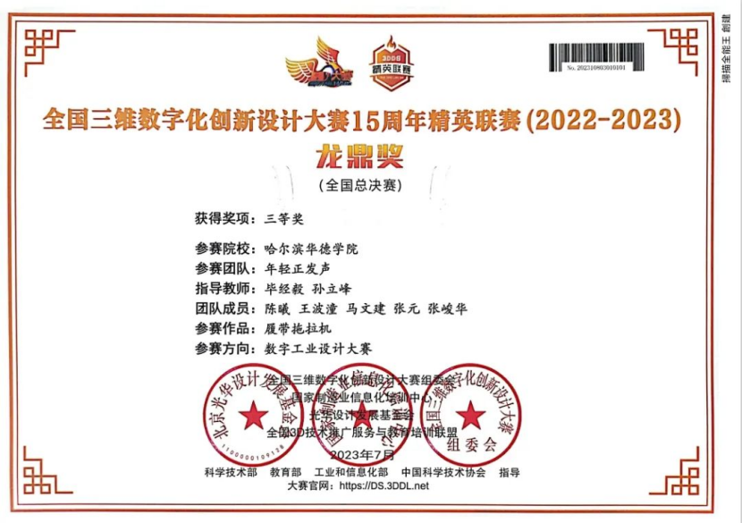 2022年,全国三维数字化创新设计大赛第15届3D大赛黑龙江赛区一等奖;
