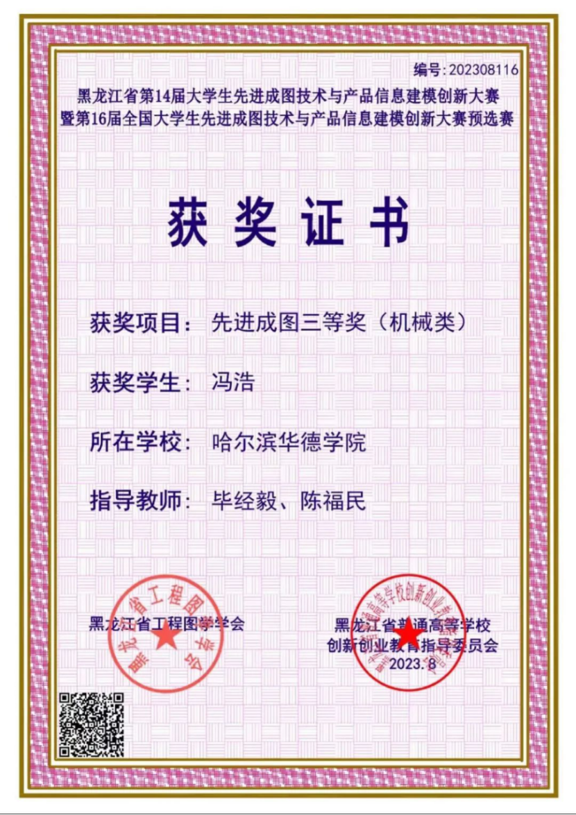 2023年,第十四届黑龙江省“龙江杯”大学生先进成图技术与产品信息建模创新大赛中荣获机械三维建模省级三等奖3项;