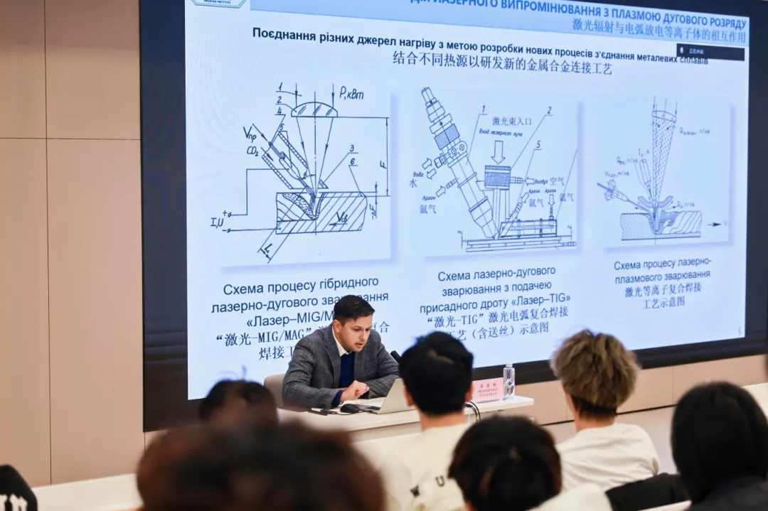 佩列申科·斯维亚托斯拉夫主任为线上及线下师生作了题为《金属合金的等离子弧与激光复合焊接技术》的精彩学术报告。 他系统阐述了激光辐射与电弧放电等离子体相互作用的物理机制,全面梳理了激光等离子复合焊接工艺的研究现状与发展趋势,重点分析了该技术中协同效应的具体体现特征,深入探讨了不同焊接条件对钢焊接接头微观组织与力学性能的影响规律,并揭示了焊接过程中应力变形状态的形成机理。最后,佩列申科·斯维亚托斯拉夫主任还分享了其在激光等离子复合焊接设备研发方面的最新进展与工程实践经验。在场师生踊跃提问,就复合焊接的热源匹配等关键技术问题与佩列申科·斯维亚托斯拉夫主任进行了深入的交流与探讨,现场学术氛围浓厚。