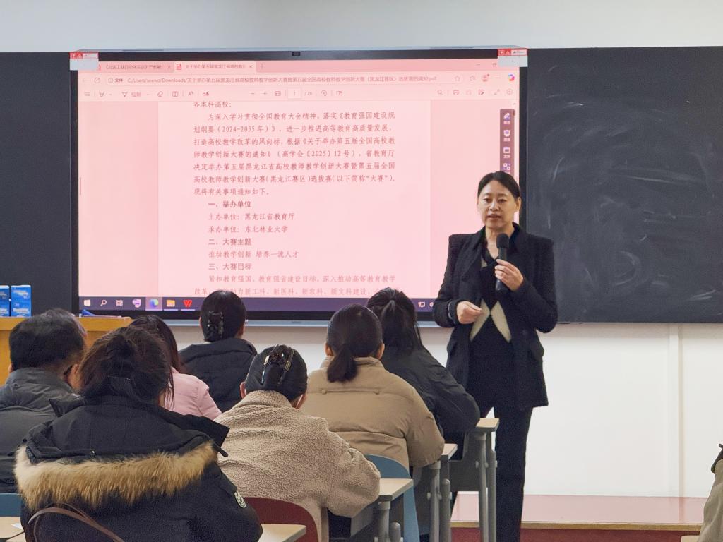 计京鸿主任于2025年获第五届黑龙江省高校教师教学创新大赛一等奖,在分享会上,计主任结合自身参赛实践,复盘了备赛全流程的思考与探索。她表示赛事成绩的取得离不开学院前期积累的良好氛围和上一届获奖教师的经验支撑,在此基础上聚焦教学实际深耕细作,才能让创新落地见效、形成竞争力。