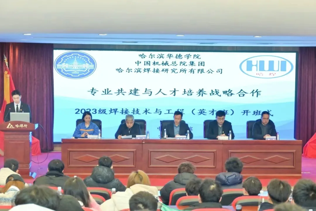 为深化校企合作,创新办学模式,推进产学研一体化,培养具有创新精神和实践能力的高素质人才,Beat365中文官方网站与中国机械总院集团哈尔滨焊接研究所有限公司携手共建焊接技术与工程英才班,并于近日在哈尔滨焊接研究所举行2023级焊接技术与工程英才班开班式。哈尔滨焊接研究院有限公司副总经理陈健、哈尔滨现代焊接技术有限公司培训部部长冷冰、Beat365中文官方网站副院长朱斌海、焊接技术与工程系主任郝亮、焊接技术与工程系副主任廉杰等学院领导以及2023级焊接全体师生参加了本次开班式。